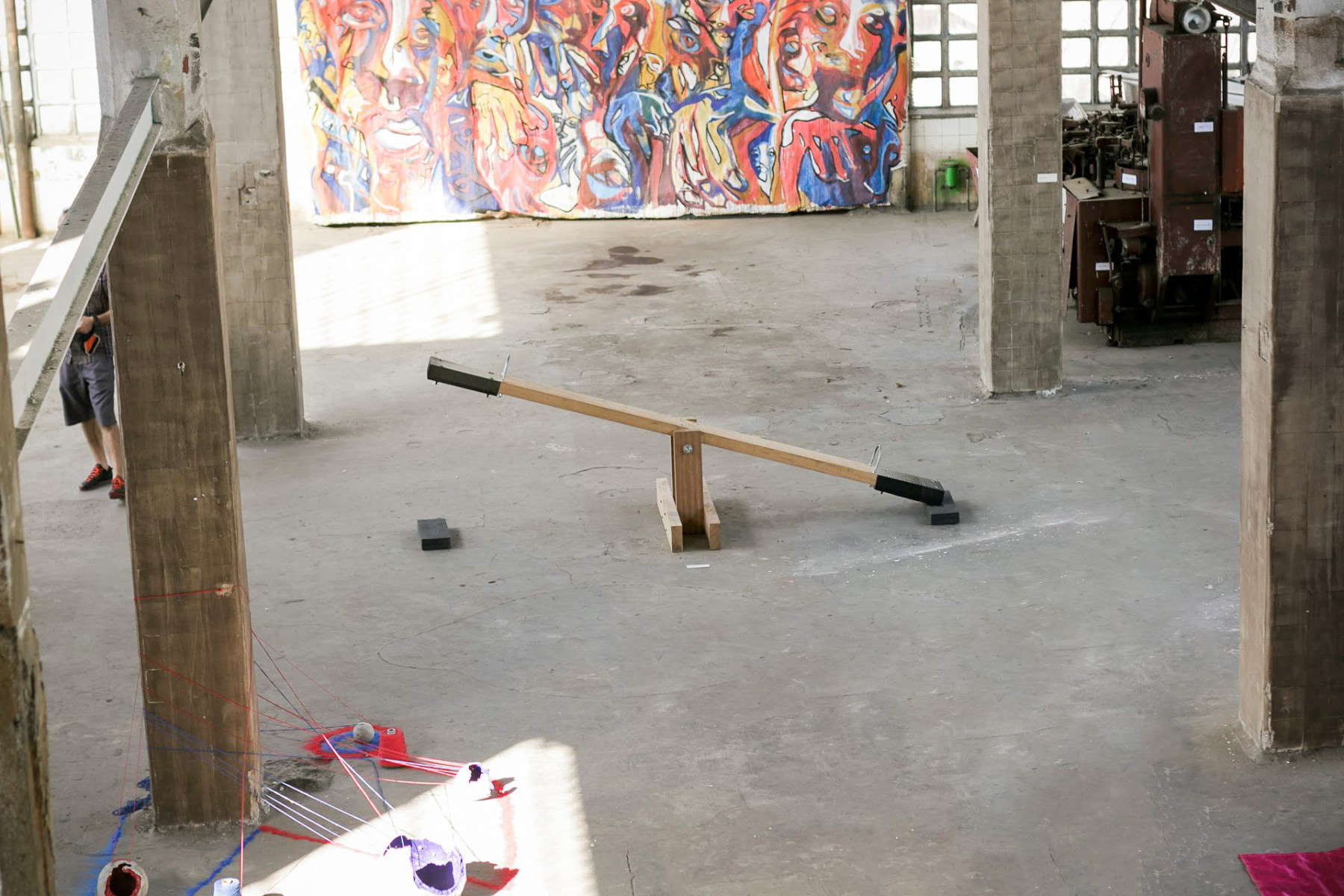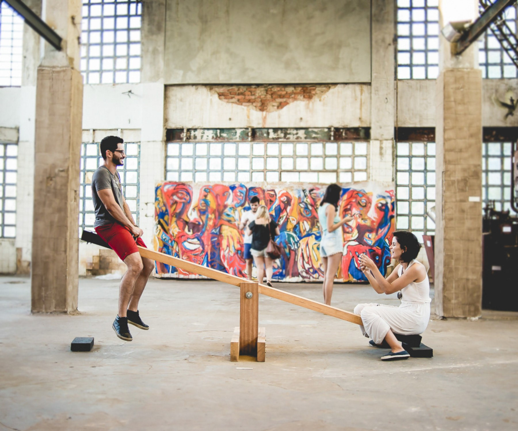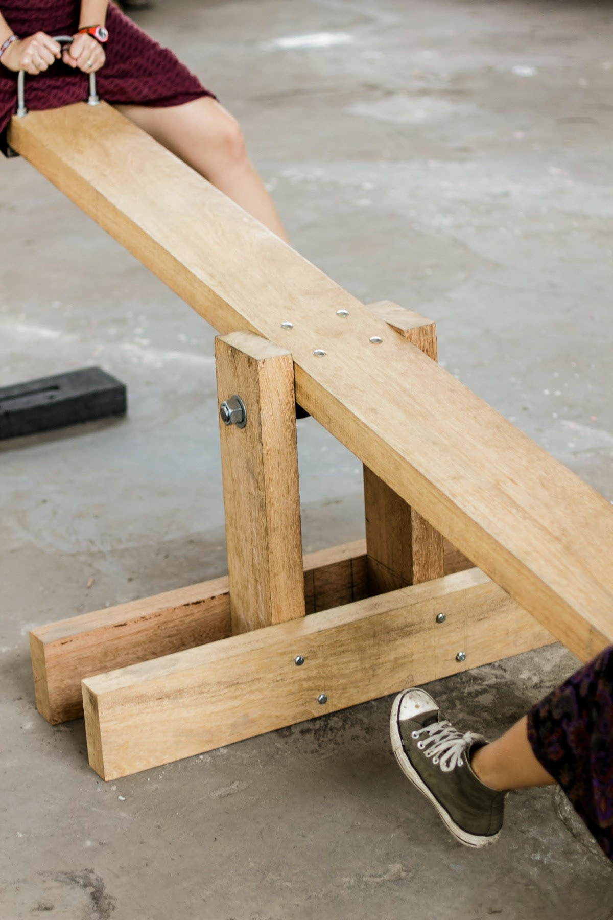 A seesaw with a 30 kg lead plate hidden under one of the two seats.